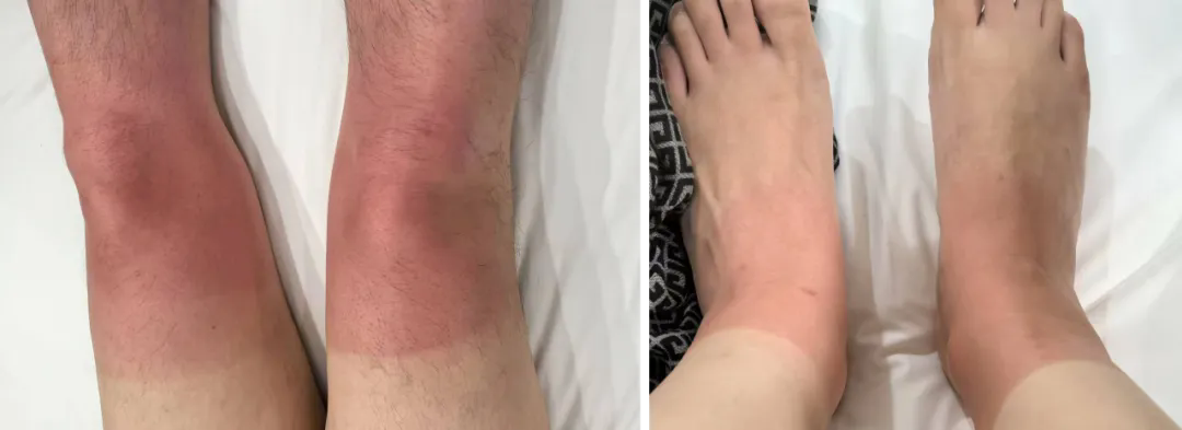像图中初期脚踝泛红情况,回家后马上用常温(15 - 25℃)清水冲洗晒伤部位,或用浸湿的毛巾冷敷,每次15 - 20分钟,间隔1 - 2小时可重复,帮助降温、舒缓泛红。之后涂抹温和保湿乳(儿童选无香精、无酒精的婴儿保湿霜,成人选含神经酰胺、透明质酸的修护乳 ),给肌肤补水锁水,促进自我修复。
